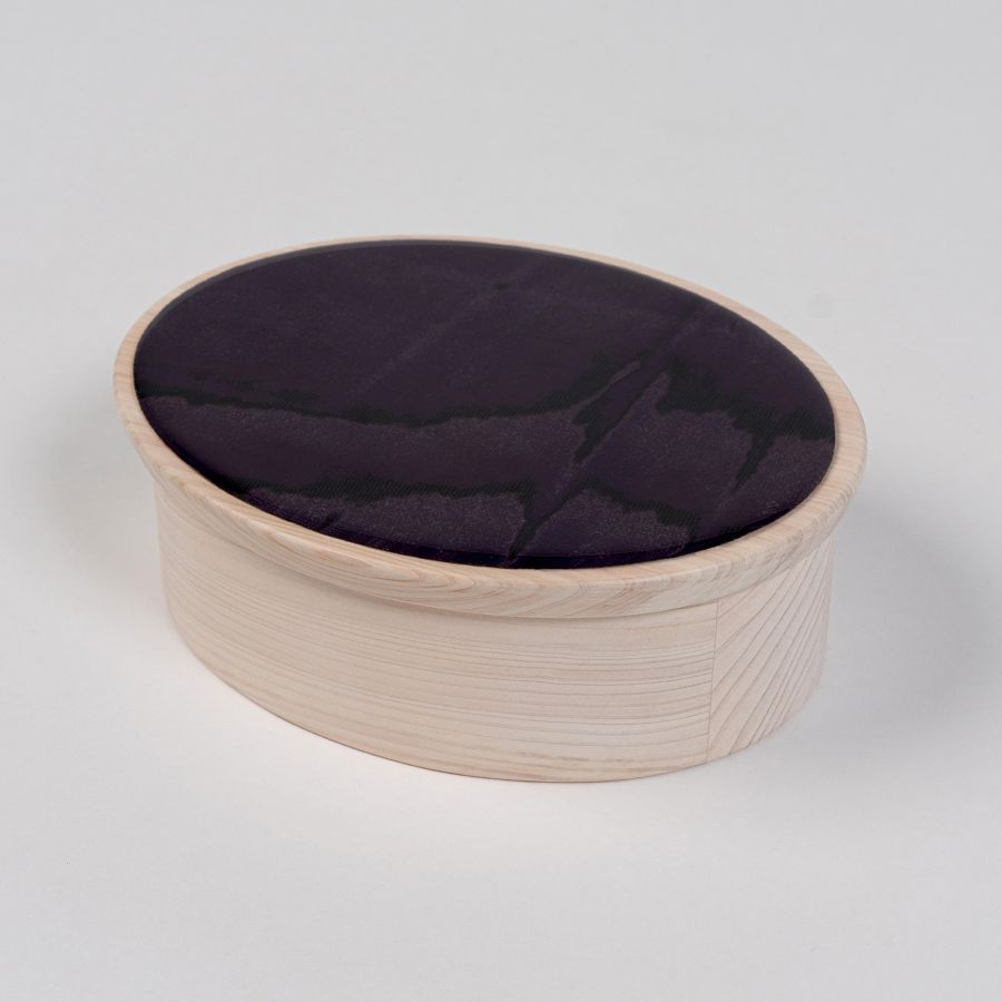 長く愛された客席の象徴である古代紫は、アップサイクルの工程を経て、当時の深みを宿しながらも、まったく新しい紫の気品へと姿を変えました。その気品ある色調に呼応するように、箱本体には白さが際立つ国産ヒノキを採用しています。